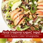 You will love this Apple Cranberry Salad with fresh greens, crispy apples, dried cranberries, creamy cheese, crispy bacon, and crunchy walnuts all tossed in an easy to make apple cider vinaigrette dressing recipe. It’s a perfect green salad for Thanksgiving, Christmas or fall.