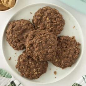 Storage: No Bake Cookies can vary in how long they last based on what ingredients go into them. With our Chocolate Peanut Butter Cookies, you can keep them in an airtight container on the counter at room tempertaure for 5-7 days. Transfer over to the fridge and they’ll keep for 1-2 weeks.