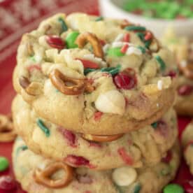 These Christmas Kitchen Sink Cookies are thick and chewy, sweet and salty. They are filled with sweet chocolate chips, M&M’s, sprinkles, salty pretzels and potato chip pieces. This modern Christmas Cookie recipe is filled with everything but the kitchen sink.