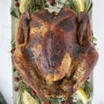 To dry brine the turkey, pat the turkey dry and season entire bird with kosher salt. Refrigerate overnight (or at least 8 hours).