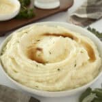 These Roasted Garlic Mashed Potatoes can easily be made ahead of time! The flavorful roasted garlic, creamy sweet butter along with browned butter with fresh herbs make this the BEST Mashed Potato Recipe. They are smooth, creamy, and so tasty!